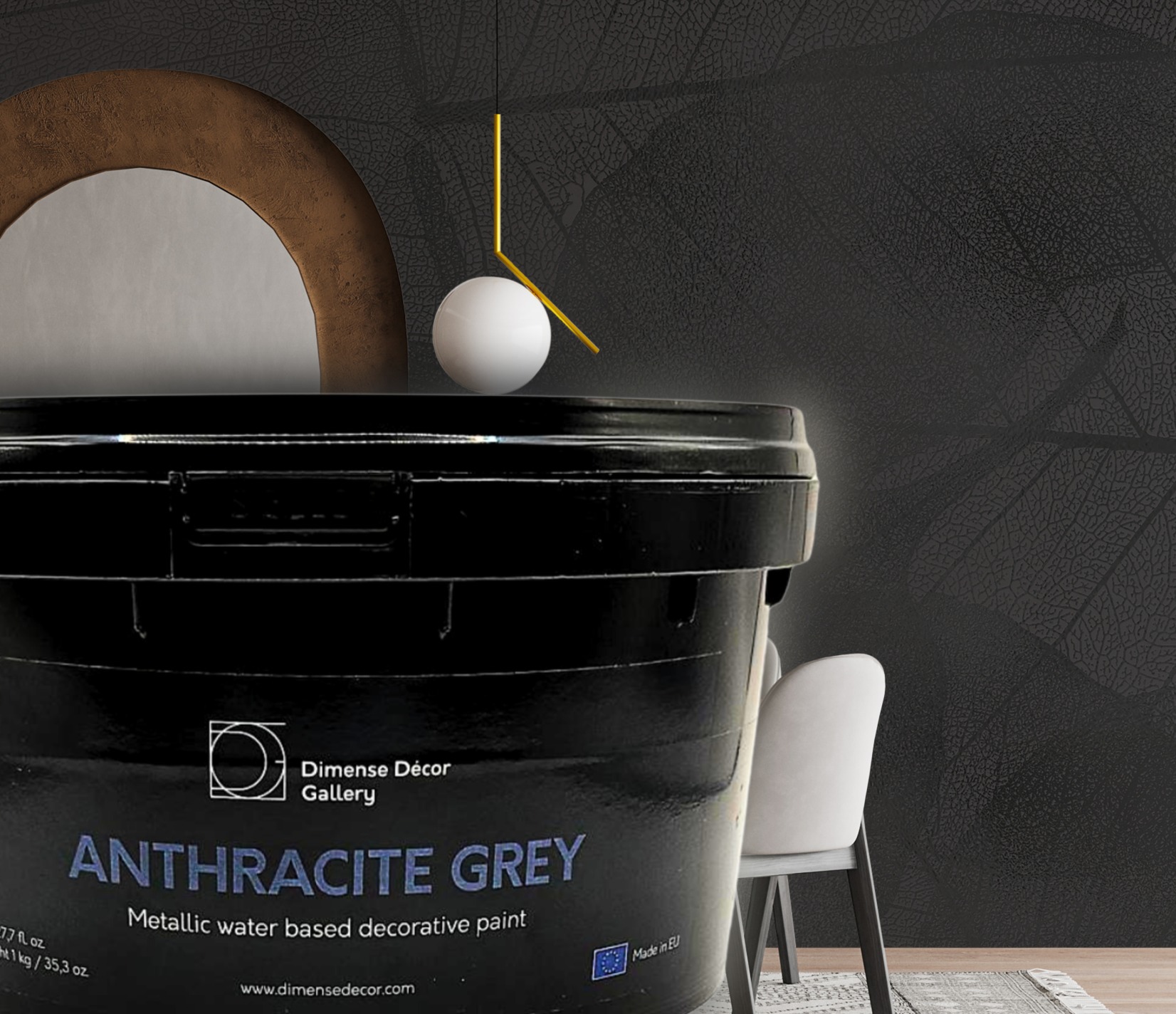 A deep, dark metallic finish in rich anthracite. Ideal for dramatic, moody interiors - it amplifies the three-dimensional quality of Dimense Décor structures with bold contrast and a sophisticated gleam.